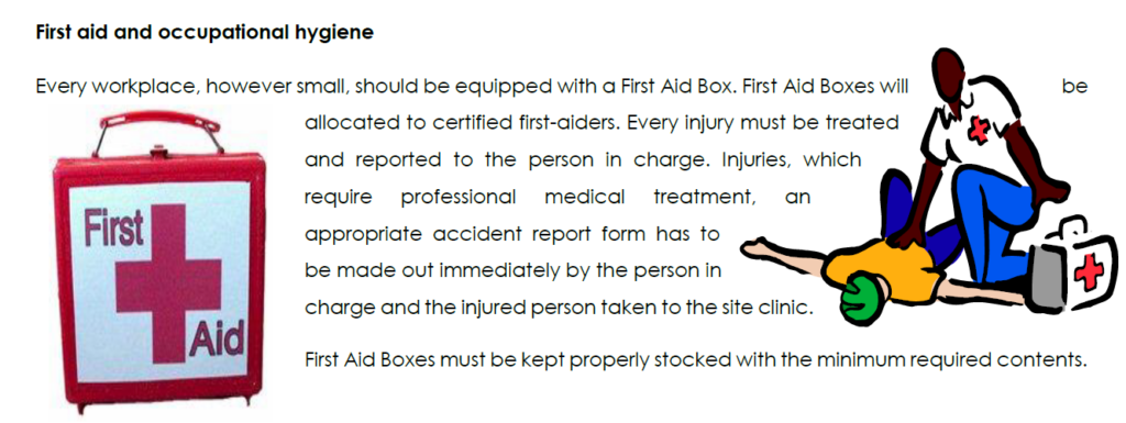 First aid rooms – these must be easily accessible, well lit, ventilated and temperature controlled, contain a sink or wash basin and a supply of hot and cold running water, as well as a means of boiling water, and should not be used for any other purposes
