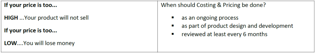 Pricing and Costing are important on-going activities for any business. If a business does not know the true cost of making a product, they may be selling at a loss. If a business prices their product without looking at the current situation in the market, they may price the product too high, and have difficulty selling.