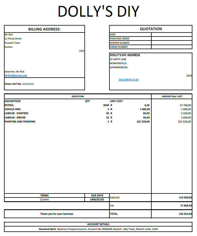 BILLING ADDRESS:Mr RichDATE11 Penny StreetPURCHASE ORDERYouwish TownVENDOR NUMBERDurbanORDER NUMBER1555Attention: Mr [email protected] VAT No: 11111111. AMOUNT (Excl. VAT) DESCRIPTIONQTYUNIT COSTPETROL 3040 R 4,20 12 768,00 VEHICLE HIRE 1 R 1 000,00 1 000,00 LABOUR – PAINTERS 36 R 60,00 2 160,00 LABOUR – DRIVER32 R 50,00 1 600,00 PAINTING AND FINISHING 1 R 101 528,00 101 528,00 TERMS DUE DATE Current 1900/01/02SubtotalACCOUNT DETAILSStandard Bank Business Cheque Account, Account No 0000000, Branch: Jolly Town, Branch code: 1234Vat 17 858,40 Thank you for your businessTOTAL 136 914,40 119 056,00 [email protected]’S DIYJOHANNESBURGQUOTATIONDOLLY’S DIY ADDRESS 55 HAPPY LANE NOWHEREVILLE