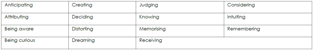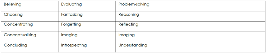 There is a variety of mental processes that may be subsumed under the word thinking. The following list highlights over 30 mental processes: