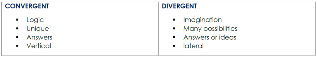 Analytical thinking is convergent, narrowing down to unique answers or a small number of ideas which can be further analysed and implemented. Creative thinking is divergent, starting from the description of the problem and diverging to give many ideas for solving it or possible answers to it. In effect, analytical thinking produces solutions and creative thinking produces ideas- large numbers of them from which the solution can be selected. Convergent and divergent are appearing more frequently in the literature of creative thinking. The two words are more colourful than analytical and creative and they do convey a mental picture of the process being followed as shown below.