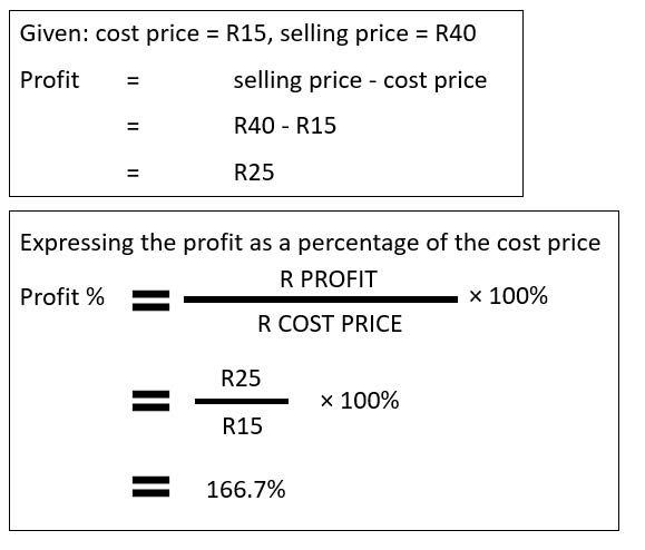 A shopkeeper buys scientific calculators in bulk for R15 each. He sells them for R40 each. Calculate the profit on each calculator in Rands, and as a percentage of the cost price.