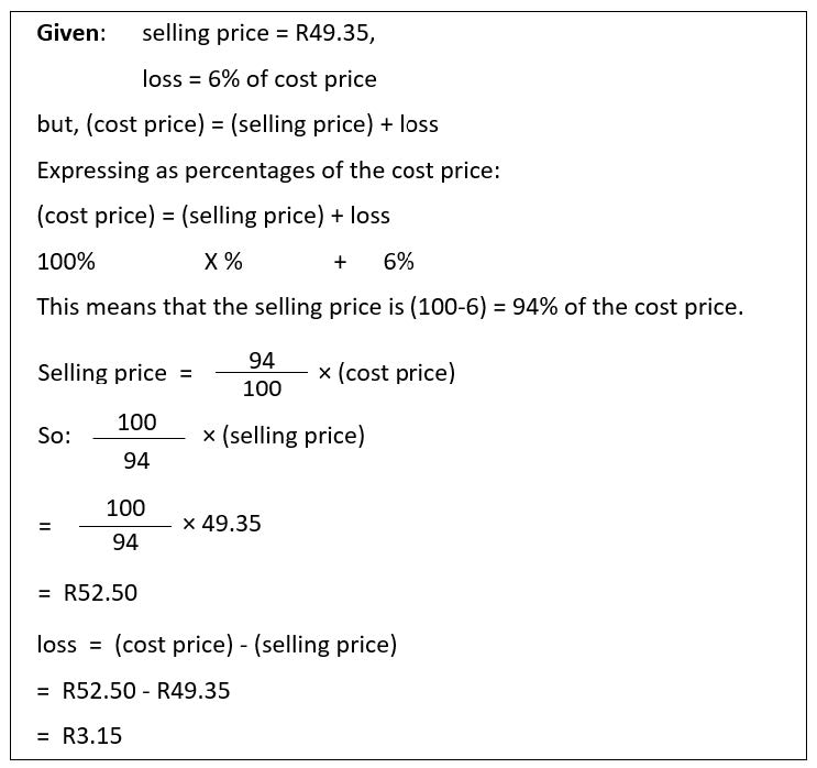 A school bookshop sells an outdated biology text book for R49.35, making a 6% loss. What was the cost price of the book, and what is the cash value of the loss?