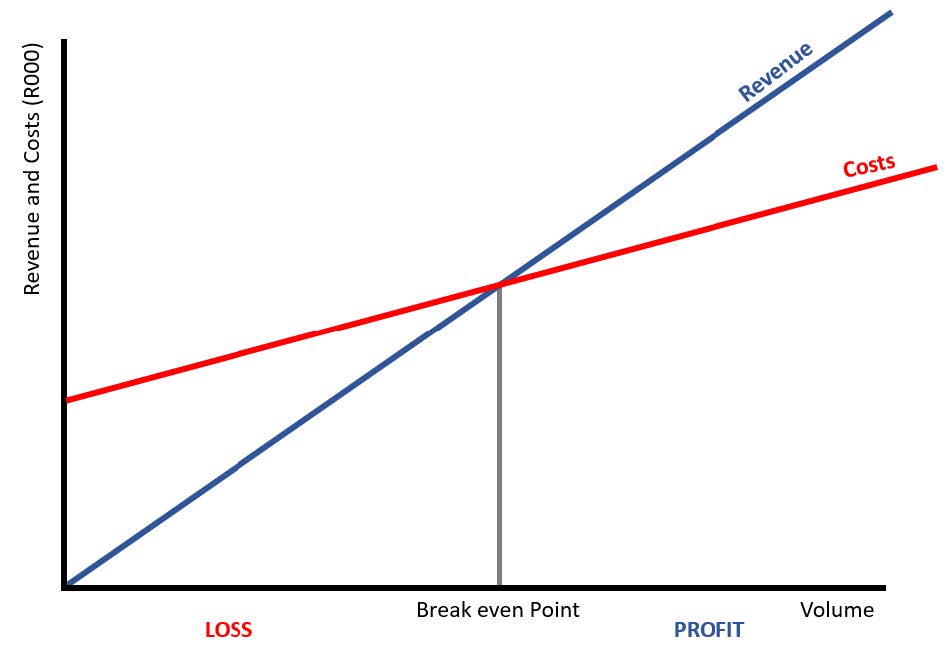 – As you can see the Revenue line starts from zero (if you don’t sell anything, you don’t generate any revenue) while the Cost line starts from a point on the R000 axis which represents the fixed costs of the business.