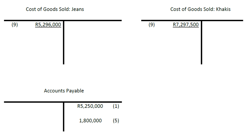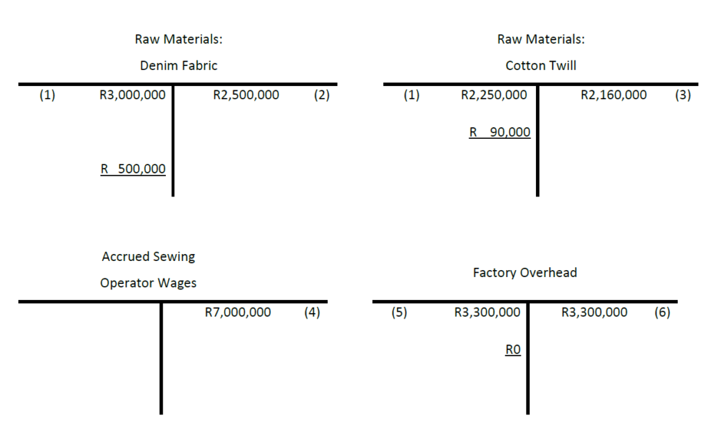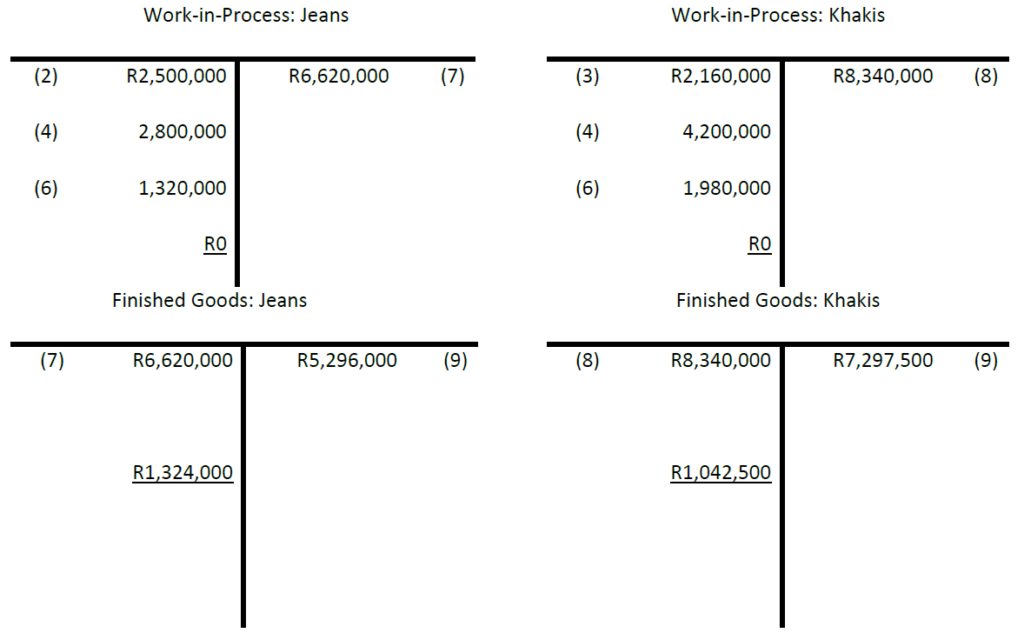 (To record sewing operator wages for the year: 200,000 hours for jeans, and 300,000 hours for khakis, at R14 per hour.)