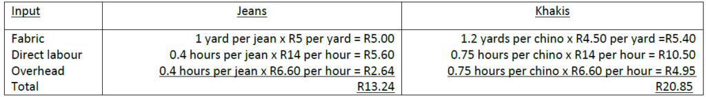 Jeans: R6, 620,000 ÷ 500,000 pairs = R13.24 per pair