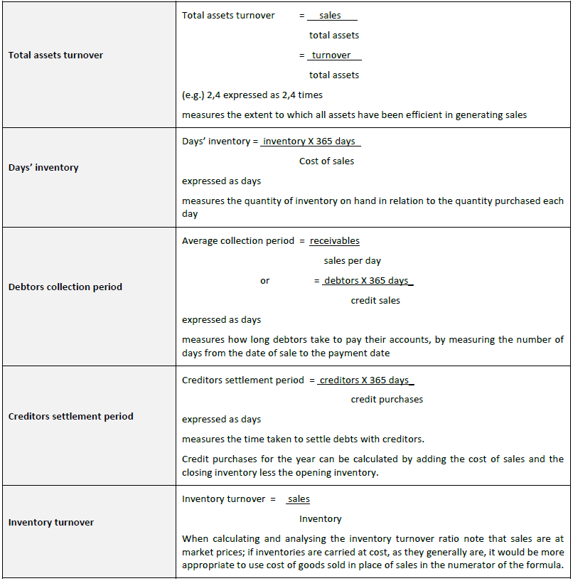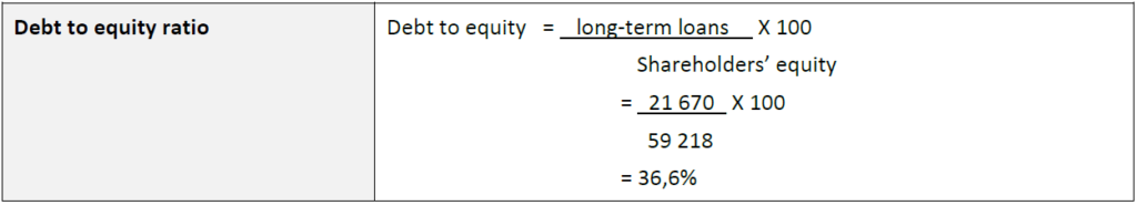 The debt to equity ratio concentrates only on long-term debt, i.e. debt that requires a reward in the form of interest. The comparison is between long-term loans and shareholders’ equity. The ratio may be interpreted to mean that for every R1 of capital provided by ordinary shareholder, 36,6 cents was raised through long-term loans.
