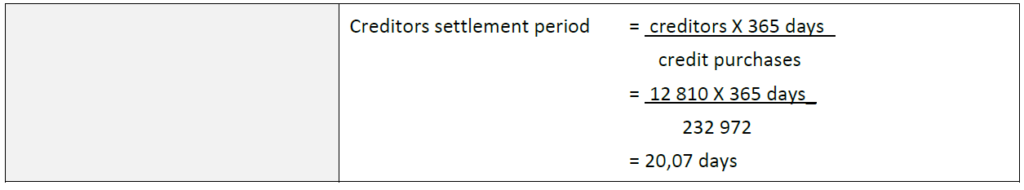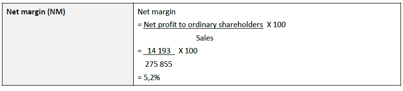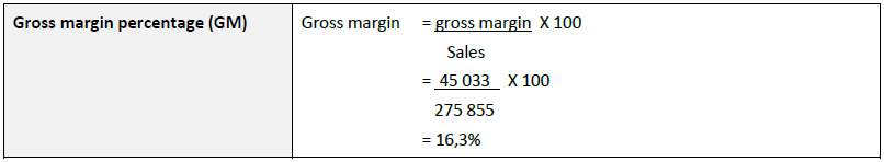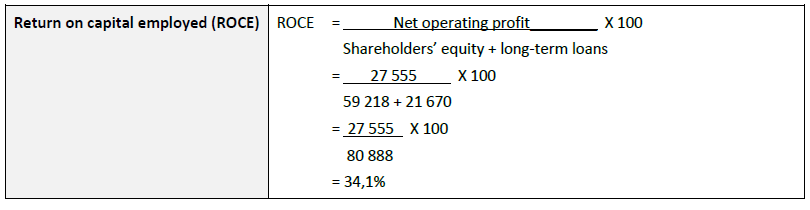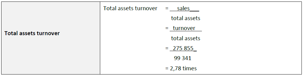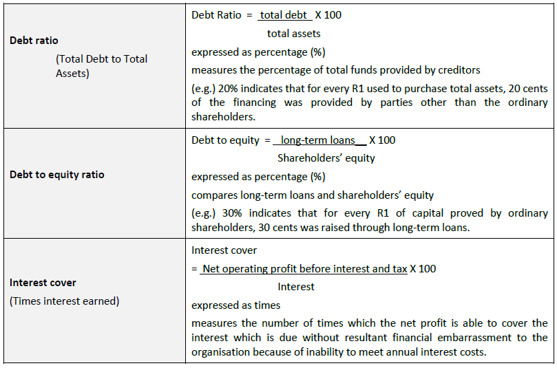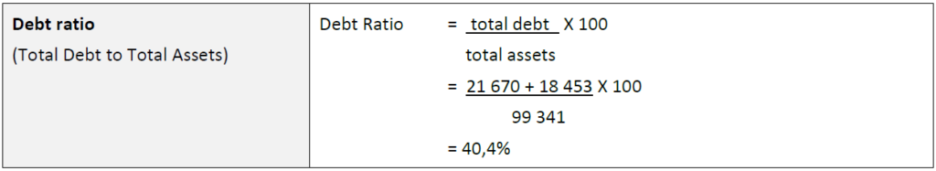 The debt ratio has been defined as total debt compared to tatal assets. The total debt includes long-term loans and current liabilities. The ratio of 40,4% indicates that for every R1 used to purchase total assets, 40,4 cents of the financing was provided by parties other than the ordinary shareholders.