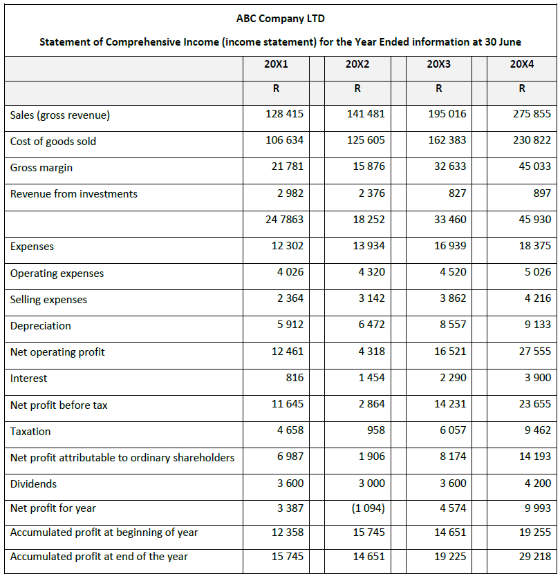 In the difficult year of 20X2, ABC Company’s creditors were most at risk of not receiving their interest as net profit achieved less than three times the required interest expense. Had it not been for investment income, the profit would only just have covered the interest commitment.