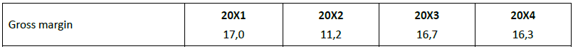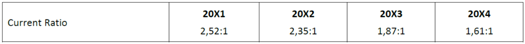 The current ratio has shown a consistent decline over the four-year period, from a high of 2,52 in 20X1 to a low of 1,61 in 20X4.