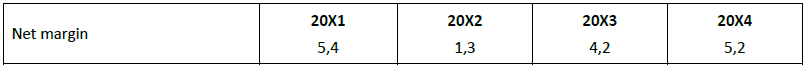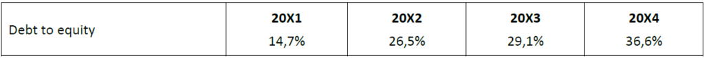 The debt to equity ratio has been a little erratic over the four years, but a definite trend to increasing this ratio is apparent, with the highest percentage of debt to equity over the four years in 20X4.