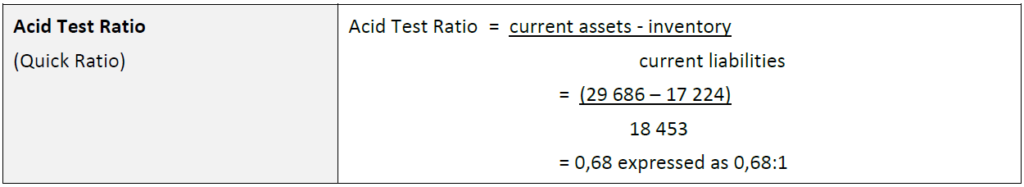 - To interpret this ratio it may be said that the company has 68 cents in cash and near cash to meet every R1 which will require repayment in the short term.