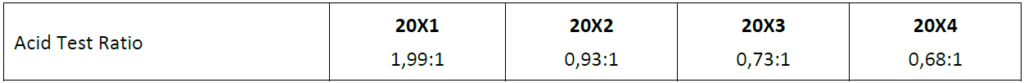 The acid test ratio has also declined dramatically over the last four years from a high of 2,19 to its current low level of 0,68.