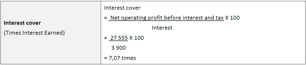 The interest cover / times interest earned ration shows the number of times which the net profit is able to cover the interest which is due. It is calculated before tax and interest in order to reflect the position most accurately.