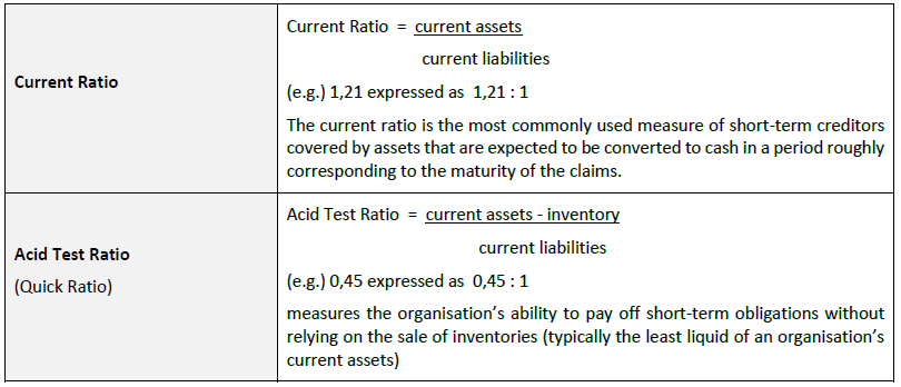 The Acid Test Ratio measures the organisation’s ability to pay off short-term obligations without relying on the sale of inventories (typically the least liquid of an organisation’s current assets).