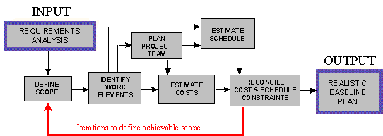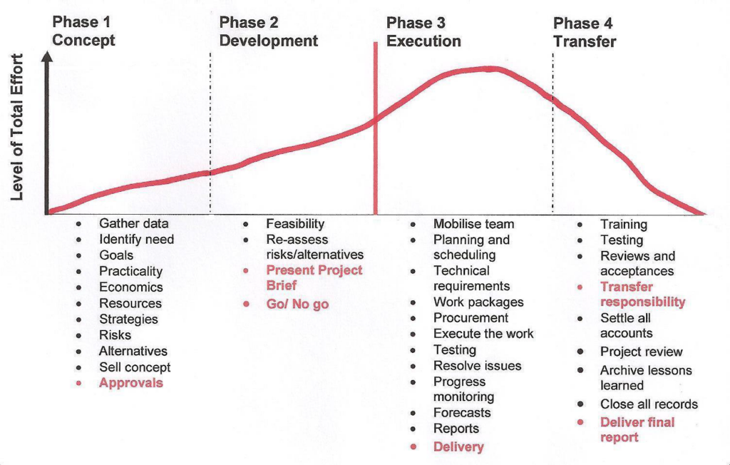 The figure below30 shows a typical project life cycle separated into its generally accepted four fundamental phases. The figure also lists the activities to be expected in each phase.