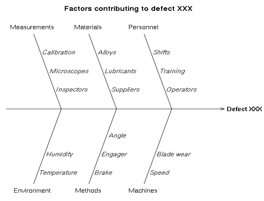 Ishikawa diagrams (also called fishbone diagrams or cause-and-effect diagrams) are diagrams that show the causes of a certain event. Common uses of the Ishikawa diagram are product design and quality defect prevention, to identify potential factors causing an overall effect. Each cause or reason for imperfection is a source of variation. Causes are usually grouped into major categories to identify these sources of variation. The categories typically include: