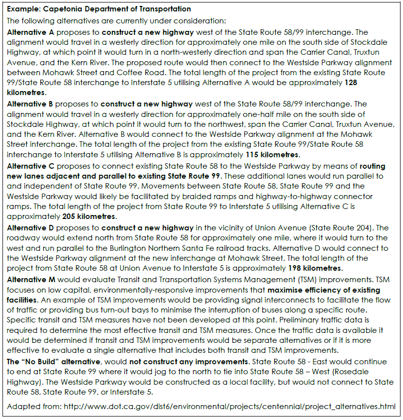 Standard alternatives: In addition to a creative range of alternatives, several standard alternatives can be presented and analysed. These alternatives help “bound” the extremes of management alternatives. Examples include: