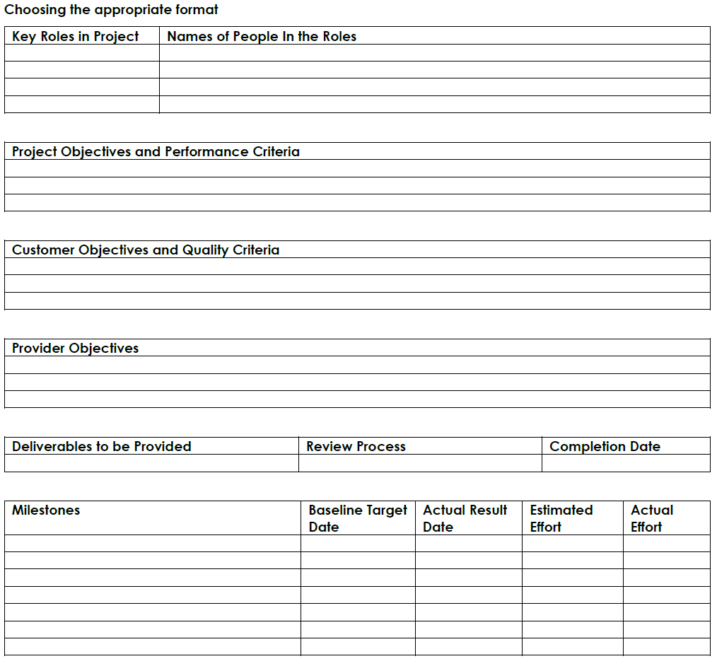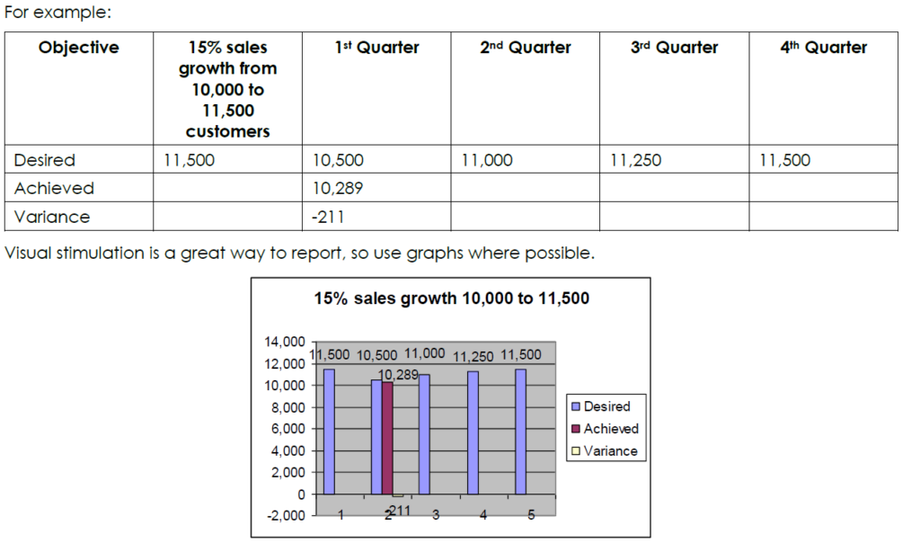 In selecting your reporting format, you want to convey desired versus actual targets achieved. If there is a variance, you should support this with a contingency.
