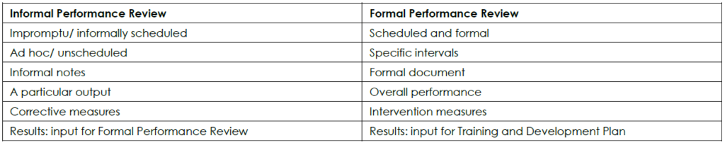 The manager holds a discussion with the individual concerned. The results of the performance review are used as input to determine processes that could improve the performance of the individual. Improved individual performance benefits the effectiveness and performance of the whole organisation.