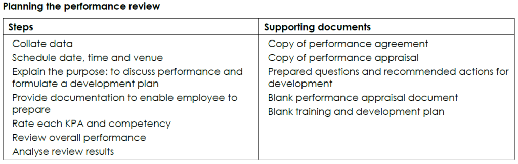 A performance review is the process of assessing current performance by an individual by rating the level of achievement of actual outputs against required target outputs, as agreed in the performance agreement, at the end of a specified review period.