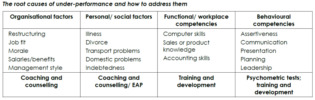 Not meeting the KPA’s and performance outputs against specific standards, despite interventions, such as feedback, review and personal development plans.